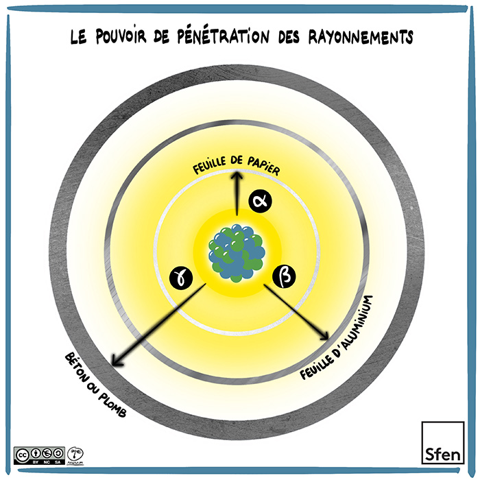- Le rayonnement « alpha » perd très vite son énergie. Il a un pouvoir de pénétration très faible. Il ne parcourt que quelques centimètres dans l’air. Une simple feuille de papier ou les couches superficielles de la peau suffisent