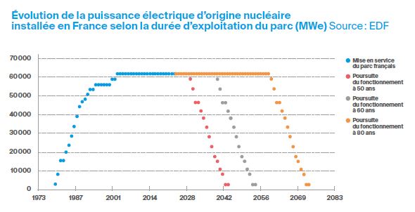 Sur la figure ci-dessus, la première courbe traduit une décroissance liée à l’arrêt définitif des réacteurs. La différence entre cette courbe et la suivante dépend de la performance et de la cohérence de l’instruction des passages de 40 à 50 ans, puis de 50 à 60 ans, pour ouvrir la voie à la DDF (Durée de fonctionnement).