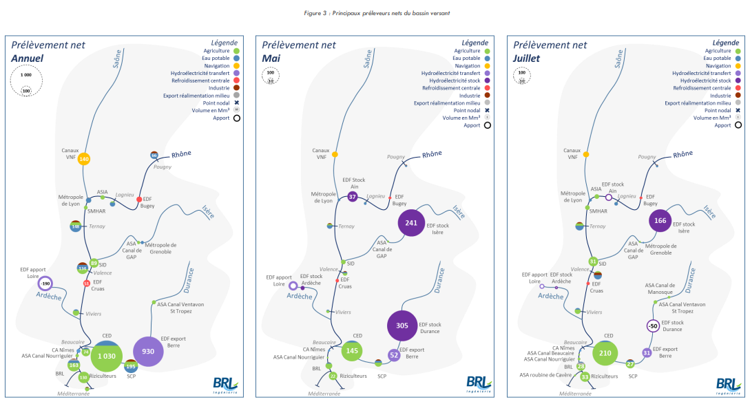 Quid de l’évolution du débit du Rhône dans les décennies à venir ? Selon les travaux de l’Agence de l’eau Rhône Méditerranée portant sur la période 2041-2070, on trouve à Lagnieu une augmentation du débit en hiver (médiane février +38%) et une baisse de débit en été (médiane août -19%). L’Agence rappelle que le premier utilisateur de l’eau du Rhône reste l’irrigation (voir ci-dessous).