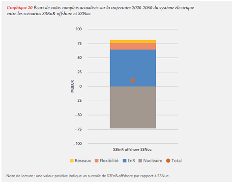 En se référant à l’étude de sensibilité menée sur les coûts complets de production du nouveau nucléaire[6] dans le rapport gouvernemental de février 2022, et compte tenu de la part du nouveau nucléaire dans S3, on peut estimer qu’en prenant un taux à 5,25 % pour le nouveau nucléaire on aboutirait à un coût complet en 2050 entre 78 et 79 €/MWh, à comparer alors au 74 €/MWh de S2, scénario le moins cher.