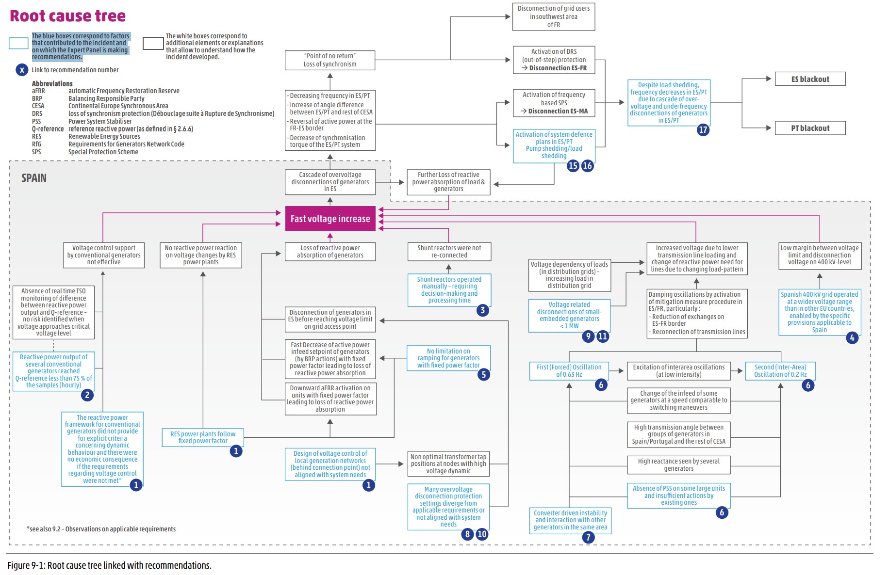 Concrètement, trois grands sujets sont mis en avant comme « causes profondes » : le contrôle de la tension, les effets des oscillations de fréquence, et la gestion des déconnexions des unités de génération ou d’évacuation. Elles traduisent de réels écarts de la part de tous les acteurs. A titre d’exemple, on peut citer des interprétations divergentes des obligations de contrôle de la tension. Ou les limites maximales de tension autorisées sur le réseau à 435 kV qui laissent peu de marge par rapport au seuil de déconnexion des moyens de production (440 kV). Mais du côté des producteurs d’énergie, le rapport met aussi en avant un manque de services réseau dynamiques qui auraient pu absorber la surtension.