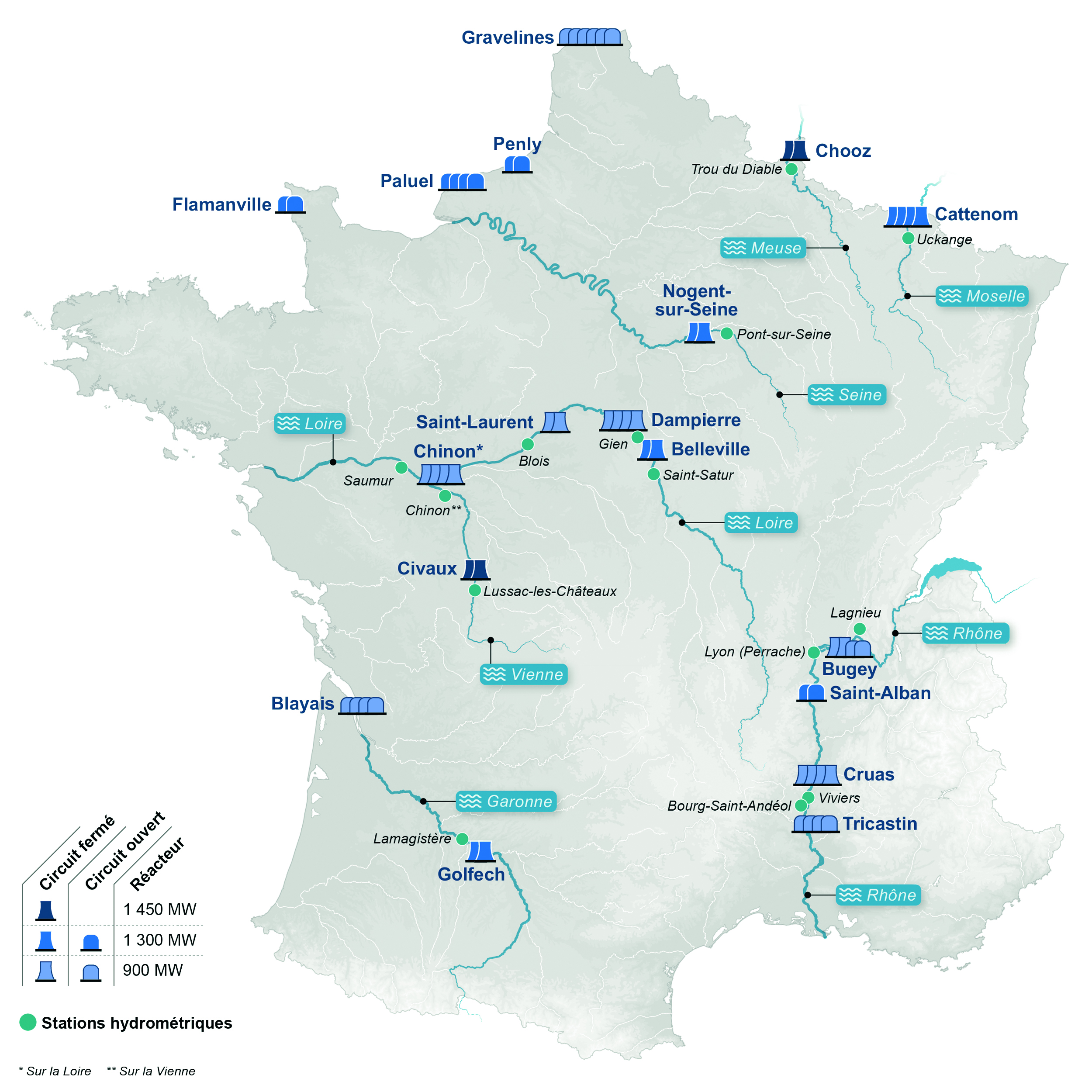 ↦ en circuit ouvert : le système prélève l’eau dans l’environnement et lui fait parcourir l’intérieur des tubes d’un condenseur. L’eau s’échauffe au contact des tubes puis retourne en totalité directement au milieu aquatique, à une température plus élevée. Un tel système a une consommation d’eau quasiment négligeable. Mais l’énergie thermique extraite du condenseur est intégralement transférée au milieu aquatique, avec une augmentation de température de quelques degrés entre la prise d’eau et l’eau restituée. En France, 26 réacteurs fonctionnent en circuit ouvert : les 18 réacteurs construits en bord de mer, et 8 des 14 réacteurs construits sur le Rhône (le fleuve français qui a le débit le plus élevé) ;