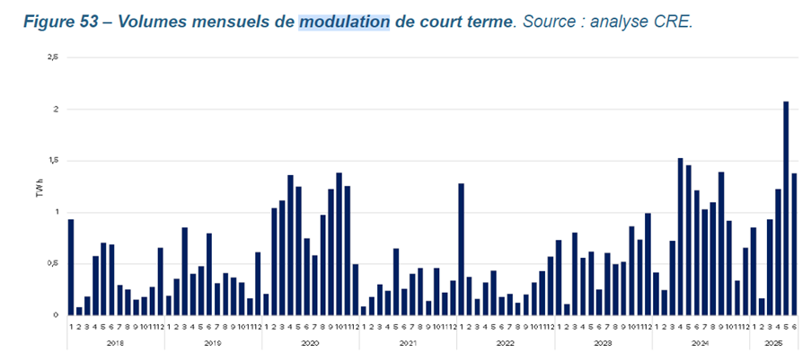 Si on exclut de l’analyse l’année 2020, qui avait connu une baisse exceptionnelle de la consommation, la CRE note que l’année 2024 marque une rupture, avec une forte hausse, confirmée en 2025, des modulations économiques de court terme.