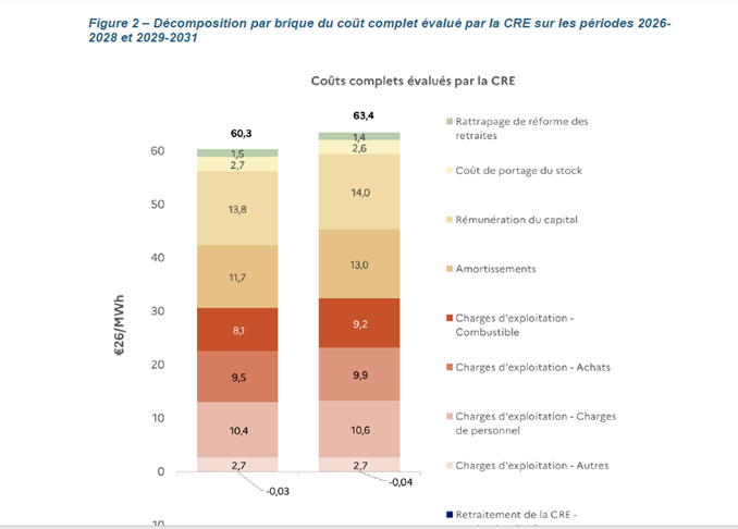 La CRE a évalué les coûts complets de production du parc nucléaire sur deux périodes successives de trois ans : – 60,3€2026/MWh pour2026-2028