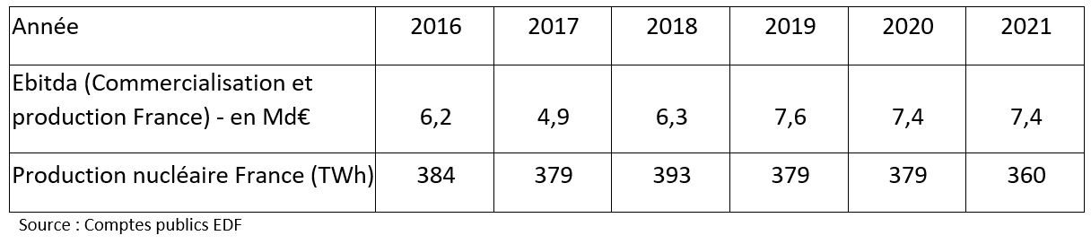 L’analyse des comptes publics d’EDF sur ces dernières années (années normales hors Covid et crise énergétique) montre que l’énergie nucléaire avait représenté en 2019, avec 379,5 TWh, 86 % de la production nette du groupe en France. Sur ces mêmes années, les « activités de commercialisation et de production » françaises ont présenté un Ebitda supérieur à 7 milliards d’euros (bénéfices avant impôts).