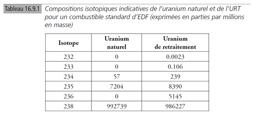 Outre l’uranium 235, l’URT contient aussi de nombreux autres isotopes. Dans le livre « Histoire et technique des réacteurs nucléaires et de leurs combustibles » (Dominique Grenêche, EDP sciences), on peut lire par exemple : « il (l’URT) contient aussi une assez forte proportion d’U236, qui est de l’ordre de 0,5 % (…). Or, cet isotope est un poison neutronique puisqu’il ne fait que capturer les neutrons sans donner naissance à un isotope fissile. De plus, il est impossible de le séparer de l’U235 lors d’une opération industrielle d’enrichissement, étant donné que les deux isotopes ont pratiquement la même masse ». L’U232 pose aussi problème, car il donne naissance à des descendants qui posent des contraintes radiologiques.