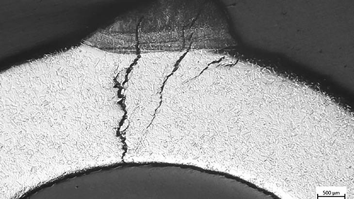Photo2 : Les techniques d’investigation (tomodensitométrie à haute résolution, microscope électronique à balayage, spectromètre à rayons X à dispersion d’énergie et observation métallographique) ont révélé des fissures dans les tuyaux de refroidissement du bouclier thermique, comme celles que l’on voit ici, d’une profondeur de 2,2 mm et traversant toute la largeur du tuyau – ©ITER
