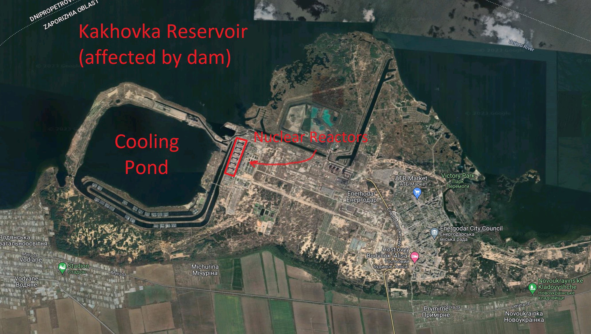 La centrale utilise le réservoir comme source froide pour refroidir les cœurs des six réacteurs et les piscines de combustibles usés. Dès l’annonce de la destruction du barrage, l’Agence internationale de l’énergie atomique (AIEA), qui a des inspecteurs sur place, a réagi sur twitter indiquant : « L’AIEA a pris connaissance de rapports faisant état de dommages au barrage de Kakhovka en Ukraine ; les experts de l’AIEA à la centrale nucléaire de #Zaporizhzhya surveillent de près la situation ; il n’y a pas de risque immédiat pour la sûreté nucléaire ».