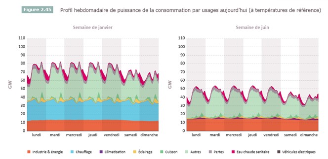 RTE, dans son BP 2023-2035, souligne que les courbes de charge hivernales et estivales présentent des différences notables en niveau, du fait des différences de températures extérieures et des usages de climatisation (en été) et surtout de chauffage (en hiver). Le système électrique français se caractérise ainsi par une forte thermo-sensibilité induite par le chauffage électrique : le gradient hivernal (sensibilité de la consommation à la baisse de température en hiver) est aujourd’hui estimé à 2 400 MW/°C. Les courbes de consommation électrique sont à un niveau plus élevé en hiver qu’en été, et le système électrique français est organisé et dimensionné en conséquence. Les arrêts pour rechargement de combustible des réacteurs nucléaires sont positionnés plutôt en été, pour avoir le maximum de ressources disponibles en hiver. RTE note aussi que les courbes hivernales et estivales possèdent beaucoup de caractères communs, dictés par le rythme des activités économiques et domestiques. La consommation est plus élevée le jour que la nuit, et en jours ouvrés qu’en week-end, les tarifications heures pleines/heures creuses déclenchent un certain nombre d’usages.