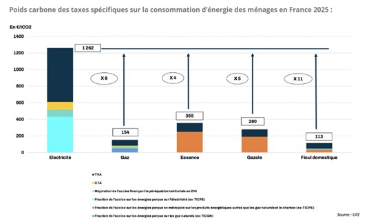 Selon RTE [8], les systèmes de chauffage basés sur l’électricité (aujourd’hui principalement des radiateurs à effet joule) sont surreprésentés dans les logements de petite taille, mais aussi dans les logements ayant les meilleures performances énergétiques. Il est important aussi de rappeler, quand on parle de précarité énergétique, que les ménages chauffés à l’électricité sont plus taxés que ceux chauffés au gaz. L’électricité, pourtant bas carbone en France à près de 95 % (RTE 2024), est non seulement discriminée par le mécanisme du CEP, mais aussi deux fois plus taxée que le gaz fossile pour le particuliers. Au 1er aout 2025, l’accise sur le gaz est à 15,43 euros par mégawattheure (MWh), soit deux fois moins que l’accise sur l’électricité pour la catégorie « ménages et assimilés » (29,98 euros/MWh). Selon l’Observatoire de l’électricité[9], la consommation d’électricité est taxée à hauteur de 1 262 € par tonne de CO2 émise en 2025, 11 fois plus que la combustion de fioul domestique et 8 fois plus que la combustion de gaz naturel.