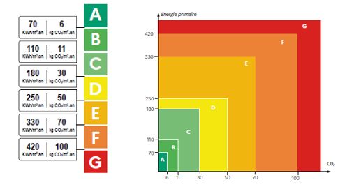 Le DPE est un outil essentiel de pilotage de la politique énergétique dans le bâtiment, en renseignant sur la performance énergétique et climatique d’un logement ou d’un édifice. Depuis juillet 2021, il comporte deux étiquettes, chacune allant de A à G : une étiquette liée à la consommation énergétique conventionnelle du logement (chauffage, eau chaude sanitaire, refroidissement, éclairage, auxiliaires), et une étiquette liée aux émissions de CO2 associées. On estimait au 1er janvier 2024 à 4,2 millions [3] (environ 14 % des résidences principales) le nombre de logements ayant une étiquette F ou G. Ces logements sont qualifiés de « passoires énergétiques ». La loi Climat et Résilience (2021), dans l’objectif d’accélérer le rythme de rénovation des logements les plus mal isolés, a établi l’interdiction de louer un logement ayant une étiquette énergétique G après 2025, F après 2028 et E après 2034.