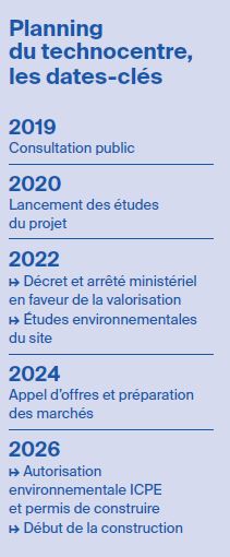 Historiquement, deux sites étaient pressentis pour accueillir le technocentre : le Tricastin et Fessenheim. Aujourd’hui, le volontarisme des pouvoirs publics pour maintenir de l’activité sur le site malgré la fermeture de la centrale nucléaire en 2020 oriente le projet dans la ville du Haut-Rhin. Avec le travail d’ingénierie – les équipes constituées par Orano et EDF continuent ainsi d’améliorer le design de l’installation – l’obtention du permis de construire est prévue pour 2026 et la mise en service en 2031. Un débat public prendra cours sur la période 2023-2024. Ce calendrier permettra de répondre à temps à l’augmentation du flux de métaux issus du démantèlement de diverses installations, que ce soit en France, et en particulier celui de l’usine d’enrichissement Georges Besse1, ou à l’étranger.