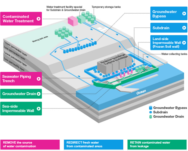 En ce qui concerne les rejets de radioactivité en mer, ils ont été drastiquement réduits par des barrières successives et des traitements. Globalement, les eaux de la nappe phréatique en amont sont pompées pour baisser le niveau de la nappe et réduire ainsi l’entrée d’eau dans les réacteurs, où elle est contaminée puis pompée pour traitement. Une barrière de sol gelé entourant les quatre réacteurs accidentés réduit encore les entrées d’eau amont et les fuites vers l’aval en détournant les eaux amont, car les soubassements des réacteurs ne sont plus étanches. Les eaux souterraines à l’aval des réacteurs sont arrêtées par un mur imperméable de 800 mètres de long, pompées dans des puits de drainage, traitées, entreposées pour contrôle, puis rejetées. Le niveau de radioactivité résiduel des rejets en mer est extrêmement faible et l’impact du site sur les eaux marines est devenu insignifiant.
