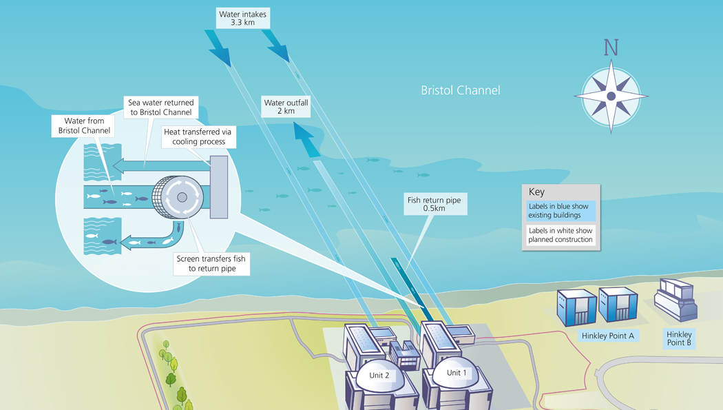 La future paire d’EPR de la centrale britannique Hinkley Point C est en construction dans le Somerset, au bord du canal de Bristol et plus précisément de l’estuaire de la Severn. EDF Energy, en charge de la centrale, a développé une série de dispositifs innovants au niveau des systèmes de prise d’eau de refroidissement pour la protection des poissons. Pour un coût total de 700 millions de livres (environ 800 millions d’euros), HPC pourrait alors s’offrir « le système de protection des poissons plus développé que celui de n’importe quelle autre centrale au monde », affirment les porteurs du projet.