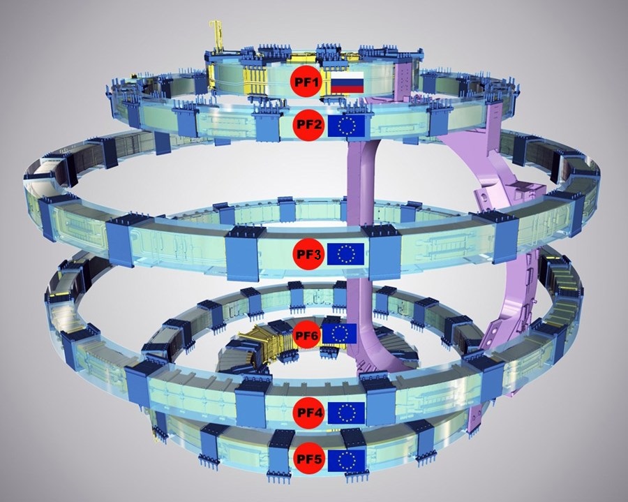 Schéma : Positionnement des bobines à champ poloïdal, NB : PF6 est le fruit d’un consortium sino européen, Source : ©ITER