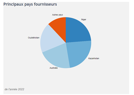 Greenpeace se base pour cela sur les statistiques d’importations d’uranium naturel (code 28441090) qui donnent la répartition suivante par pays de provenance avec pour principaux pays : Niger, Kazakhstan, Australie et Ouzbékistan.