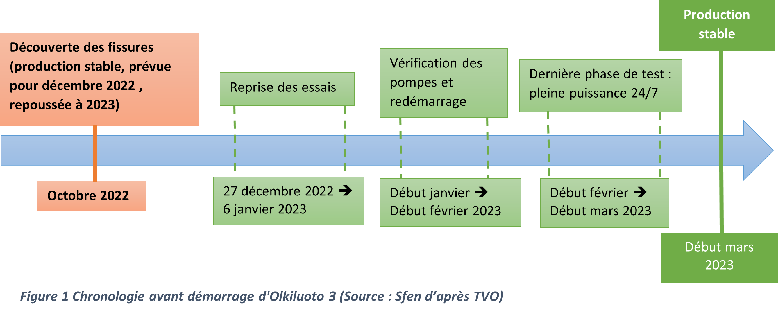 Après une interruption de deux mois, la mise en service de l’EPR finlandais a repris le 27 décembre 2022. Une série de tests restent à mener avant une production régulière d’électricité prévue début mars 2023. À pleine puissance, l’EPR produit 15 % des besoins électriques du pays.