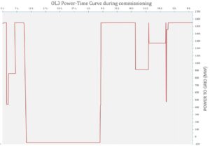 Le 3 janvier 2023 au matin, l’EPR Olkiluoto fonctionnait à une puissance de 1560 MW. Quelques heures plus tard, la puissance était abaissée à 860 MW. Celle-ci est modifiée au rythme des différents essais : variation de la puissance de 100 % à 60 % puis de 60 % à 90 %, déconnexion et reconnexion au réseau électrique, fonctionnement avec la perte d’une pompe du circuit primaire, tests de la turbine, des générateurs de secours, etc. La production d’électricité sera à nouveau interrompue dès la deuxième semaine de janvier pendant environ quatre semaines « afin d’inspecter les pompes et de redémarrer l’unité », précise TVO. Lors de la dernière phase de la mise en service l’EPR Olkiluoto sera quasiment à pleine puissance pendant un mois (voir détail ci-dessous).■