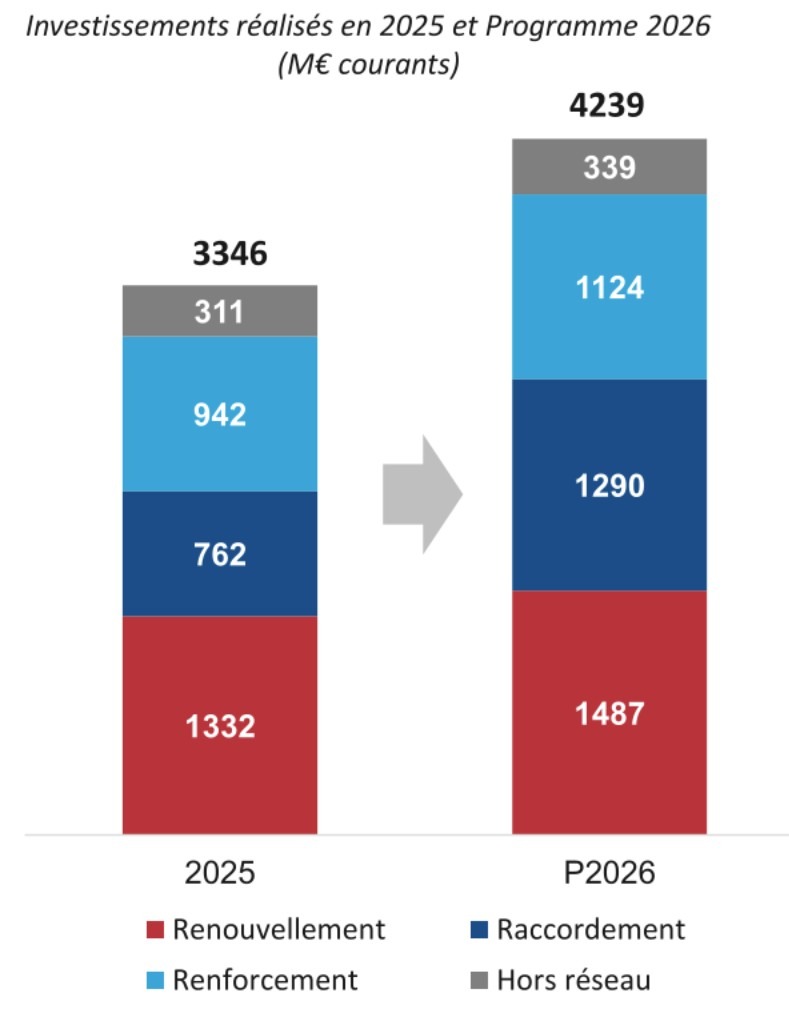 Le renouvellement du réseau constitue le principal poste d’investissement, représentant 40 % du montant total. C’est 17 % de plus qu’en 2024. Ce choix s’explique par l’ancienneté des infrastructures françaises comparée aux autres réseaux européens et pour l’adapter au changement climatique. « On a intérêt à très bien l’entretenir pour le faire durer le plus longtemps possible et rester sur un système de transport compétitif par rapport à ses voisins », prévient-il. RTE annonce une trajectoire d’investissement pour 2026 avec un programme d’investissement de 4,239 milliards d’euros. Pour 2026, l’objectif est de continuer d’augmenter les investissements dans le raccordement et le renforcement pour les consommateurs. Pour Thomas Veyrenc « C’est la priorité numéro 1 ».