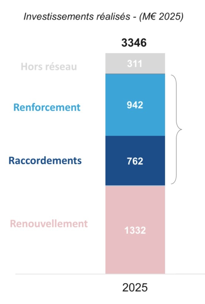 Il reste cependant du chemin à faire. RTE rappelle que la part de l’électricité dans la consommation énergétique française est de 27 %, celle des fossiles de 60 %. La France reste ainsi exposée à des dépendances. « La crise au Moyen-Orient montre l’intérêt de s’électrifier », atteste Thomas Veyrenc. Et cela passe par l’importance cruciale des investissements dans le réseau électrique français, assure RTE. « 2025, c’est une année des augmentations des investissements », explique le directeur général. Ils ont atteint 3,346 milliards d’euros en 2025, soit plus du double du niveau de 2021. « Ces investissements paraissent importants mais ils sont inférieurs à ceux de nos voisins en Europe », affirme Thomas Veyrenc.
