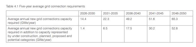 Tous les cinq ans, les États devront mettre en service de nouvelles capacités nucléaires, de plus en plus importantes à mesure que se rapproche l’objectif de 2050. Entre 2046 et 2050, 65,3 GW de nouvelles capacités nucléaires devront être construites chaque année. C’est le double du pic historique atteint au milieu des années 1980.