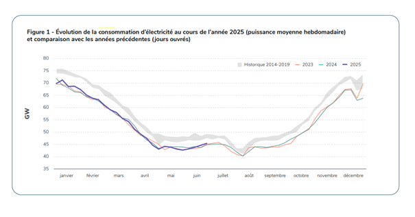 Le nombre d’épisodes de prix négatifs a continué d’augmenter au premier semestre 2025, avec 363 heures concernées, soit environ 8 % du temps. Cette croissance est due au fait que « la consommation d’électricité est restée stable ». Elle est même toujours inférieure à son niveau pré-crise Covid : 6 à 7 % en dessous de la moyenne des années 2014 et 2019.