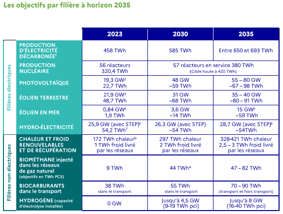 Les objectifs pour le solaire photovoltaïque et l’éolien terrestre sont légèrement réajustés. Le premier devrait atteindre 48 GW en 2030, puis entre 55 et 80 GW en 2035. L’objectif de l’éolien terrestre est fixé à 31 GW en 2030, puis entre 35 et 40 GW en 2035, en privilégiant le renouvellement et l’augmentation de puissance des parcs existants.
