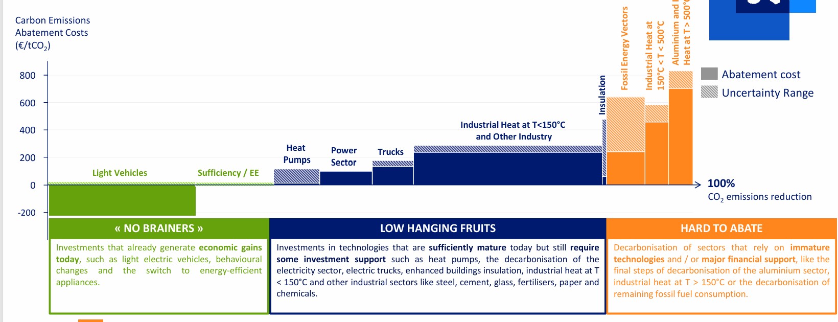 EDF suggère de prioriser les actions de décarbonation en fonction de leur coût par tonne de CO2 évitée et de leur maturité. Certaines solutions s’imposent comme des évidences : les véhicules électriques légers et les actions d’efficacité énergétique génèrent déjà des gains économiques aujourd’hui. Ce sont les leviers les plus rapides et les plus rentables à activer. Ensuite, viennent des technologies déjà matures mais encore en phase de déploiement, comme les pompes à chaleur ou les camions électriques. Elles offrent un fort potentiel de réduction des émissions, mais nécessitent encore des investissements et un soutien ciblé pour accélérer leur adoption. En dernier lieu viendront les secteurs les plus difficiles à décarboner comme l’aluminium et la chaleur au-dessus de 500 degrés.