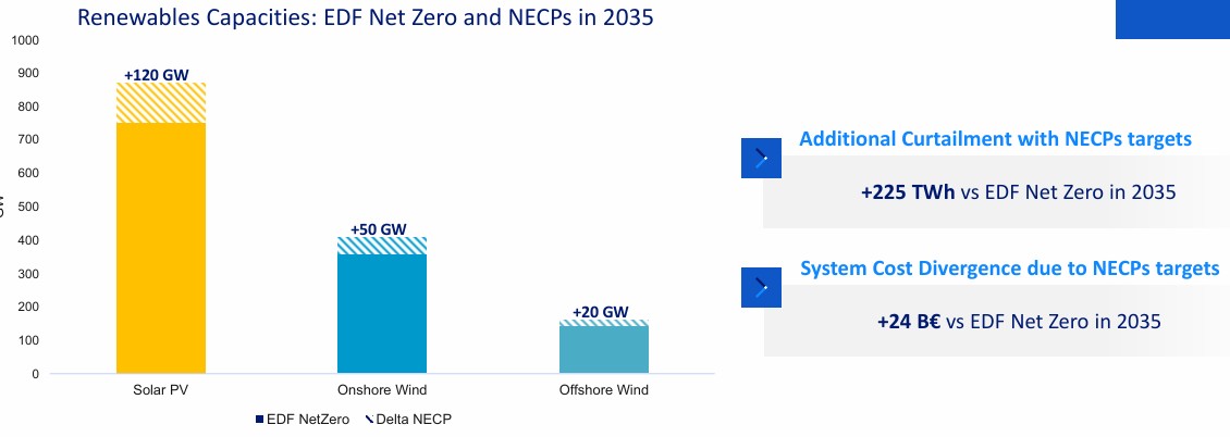 « Les systèmes énergétiques doivent travailler ensemble pour atteindre trois objectifs : la neutralité carbone d’ici 2050, sécuriser l’offre avec une balance d’investissement entre la production et la consommation et une efficacité des coûts », énumère Fabrice Noilhan. EDF souligne l’importance d’une approche coordonnée à l’échelle européenne en évaluant les impacts d’une absence d’alignement entre États membres. Le graphique ci-dessous illustre ce qui se passerait si les pays agissaient de manière isolée, plutôt que dans une logique coordonnée d’intérêt commun. Dans ce scénario, la part des énergies renouvelables augmenterait, mais au prix d’un système global plus coûteux, avec un besoin accru de soutien public.