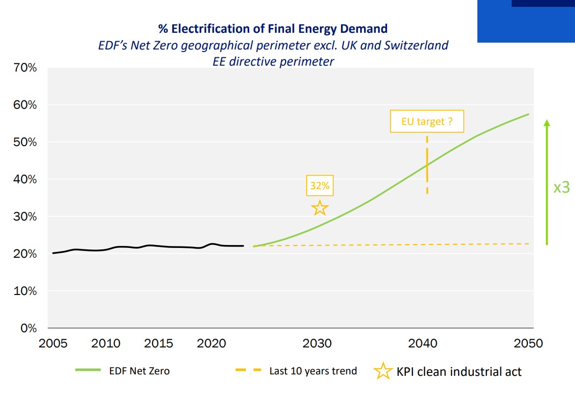 « Nous sommes convaincus que l’électrification est la clé de voûte de l’avenir énergétique de l’Europe », soutient Fabrice Noilhan. « Elle améliore la compétitivité, réduit les dépendances aux importations et supporte la neutralité carbone ». Actuellement, l’électricité ne représente que 23 % du mix énergétique européen. En 2050, EDF vise 60 %. Cet objectif montre « à quel point nous devons accélérer le rythme, surtout après des décennies de stagnation », admet Fabrice Noilhan. Les 40 % restants de la consommation finale d’énergie proviendront d’autres vecteurs décarbonés, notamment les réseaux de chaleur (environ 8 %) et la biomasse (environ 10 %).