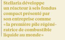 Stellaria développe un réacteur à sels fondus compact (250 MWth de production enchâssés dans 4 mètres cubes) présenté par son entreprise comme « la première pile régénératrice de combustible liquide au monde ».