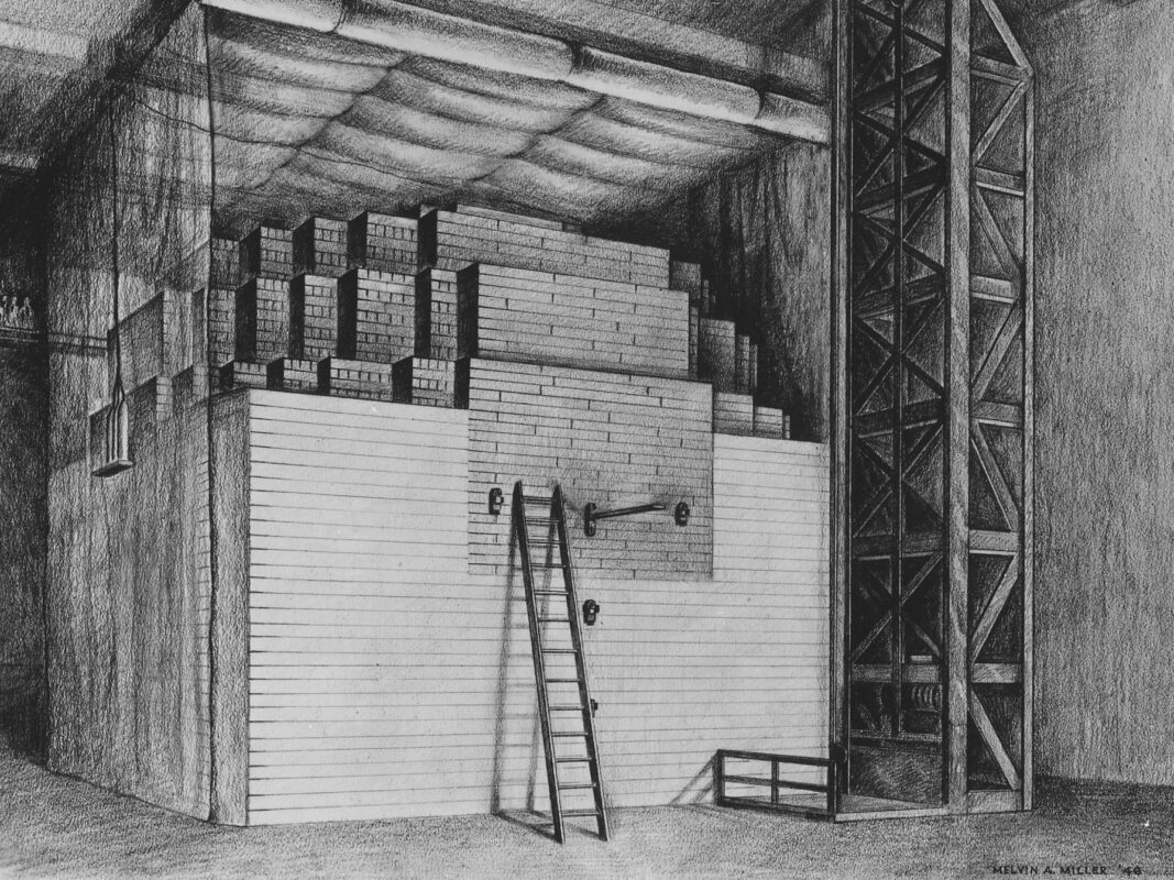Dès la deuxième moitié de l’année 1942, les piles deviennent prometteuses au niveau de la criticité, notamment grâce à l’utilisation de matières radioactives purifiées. Les premières ébauches de réacteurs commencent alors à être faites, avec une pile sphérique composée de 57 couches de réseau d’uranium et de graphite et des barres des contrôles en bois recouvertes de cadmium. En fin d’année cette première pile critique, appelée CP-1, était en construction … à un rythme effréné.