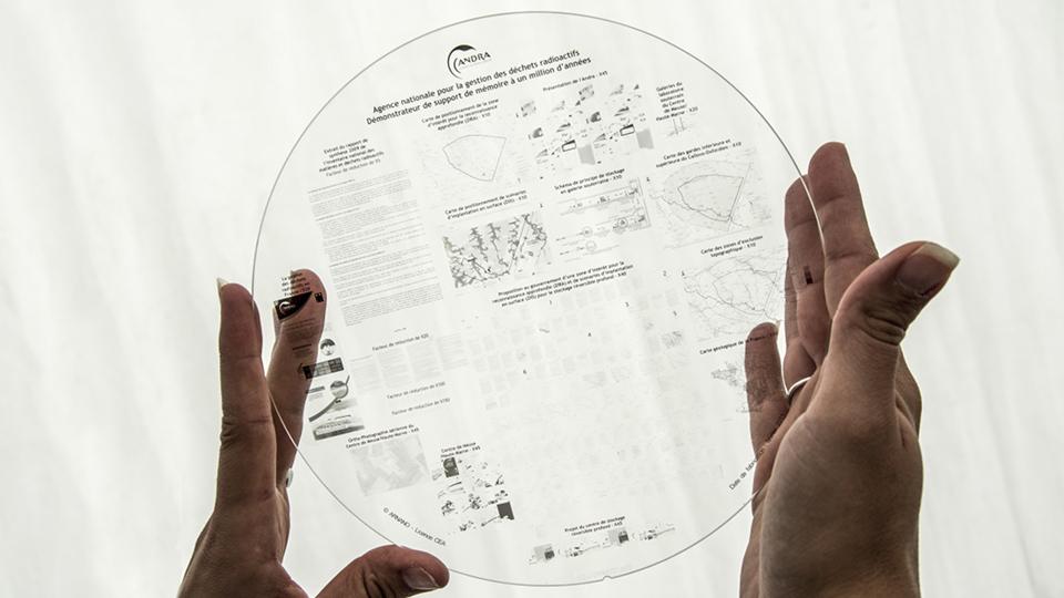 Un disque de saphir est aussi un très bon candidat pour cet objectif : peut contenir l’équivalent de 10 000 feuilles de papier A4, totalement transparent et incolore ainsi qu’une résistance à une température supérieure à 1600°C et insensible aux attaques chimiques et aux rayures.