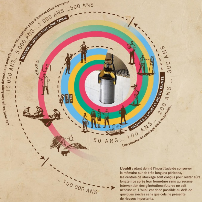 Cigéo a été conçu pour être réversible pendant au moins 100 ans pour permettre aux générations futures si elles le souhaitent de pouvoir récupérer les déchets, dans le cas où, par exemple, une meilleure solution serait trouvée d’ici là. C’est ce qu’on appelle la réversibilité. Passé ce délai, le site sera scellé et il est nécessaire de ne pas laisser tomber ces déchets dans l’oubli : d’où le principe de mémoire. Le site devra être surveillé pendant au moins 300 ans, cela permettra de garantir la mémoire de l’existence du site. Au-delà de 500 ans, l’ASN a autorisé, du point de vue de la sûreté, l’éventualité de l’oubli.